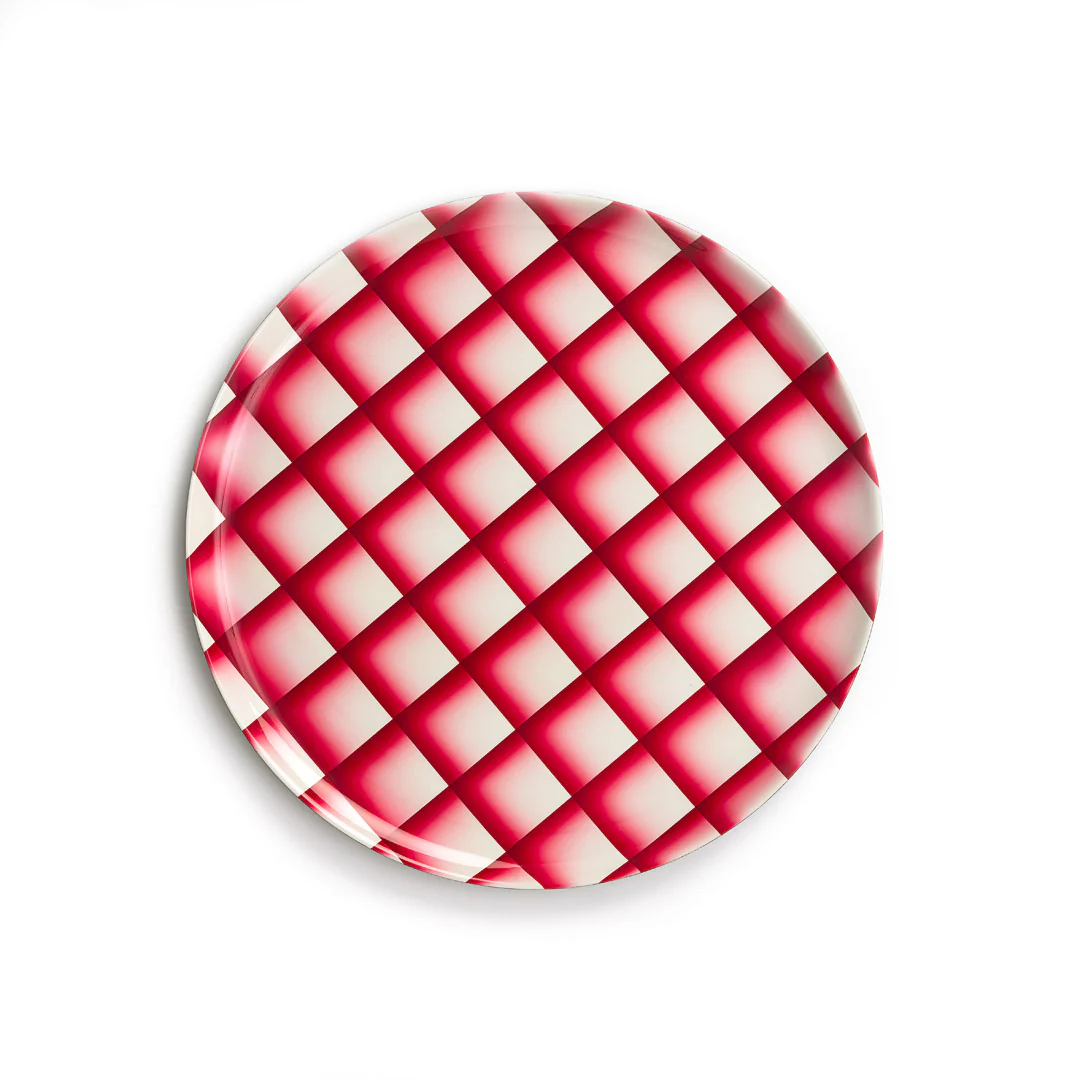 Stunning lacquered bamboo serving trays by India Mahdavi featuring geometric shapes in bright hues.