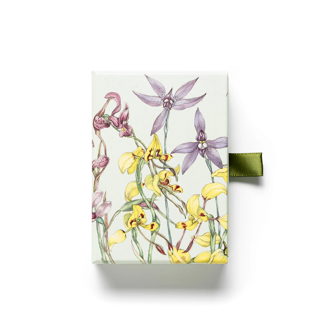 This set of playing cards features a floral illustration from Fanny Anne Charsley's series The Wildflowers around Melbourne, housed in a decorated sliding tray box.